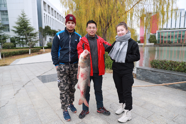 经过三个多小时的奋战,装框、称重,共捕获花鲢、草鱼、鲤鱼等一千多斤鱼。现场的一群来自俄罗斯、乌克兰、韩国的留学生们第一次看见这么壮观的捕鱼场景,大家兴奋地围着一条二十多斤重的大白鲢自拍合影,纷纷点赞,学校校园湖水水质好,没有受到任何污染,这鱼是纯正的野生鱼啊。