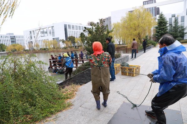 一年一度北风劲。清晨,盐城工业职业技术学院的生态湖边,聚集了许多师生围观,一群捕鱼人早已拉开了架势,一张巨网在捕鱼人娴熟的动作下悠悠地横亘在碧波荡漾的湖面,湖面波光粼粼,水深不惊,渔网洒下静静地等候。