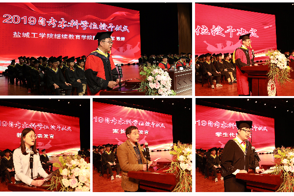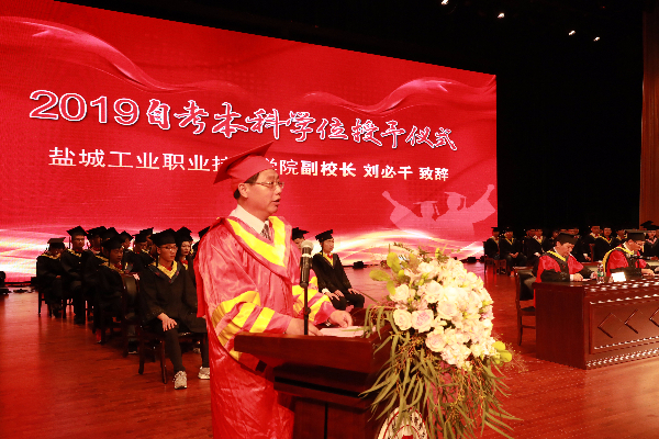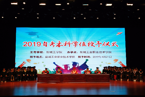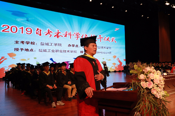 4月21日上午, 我校在大学生活动中心举行2019届自考本科毕业生学士学位授予仪式。我校副校长刘必千,盐城工学院继续教育学院院长杨军,我校继续教育学院院长林元宏、教务处处长刘华、学工处副处长孙干一同为学生颁发学位证书,拨穗正冠。参加盐城工学院自考本科获得学士学位的193名毕业生和家长、1200多名师生参加活动。林元宏主持仪式。