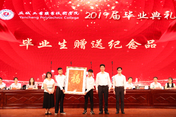 邵从清代表学校接受了毕业生赠予母校的四件礼物,分别是纺织服装学院的十字绣《天下第一福》、经贸管理学院的雕刻画《桃李满天下》、艺术设计学院的山水画《云山泉韵》、九洲药学院的工艺花瓶《富贵牡丹瓶》。所有赠礼都寄予了全体毕业生对母校各项事业蒸蒸日上的美好祝愿。