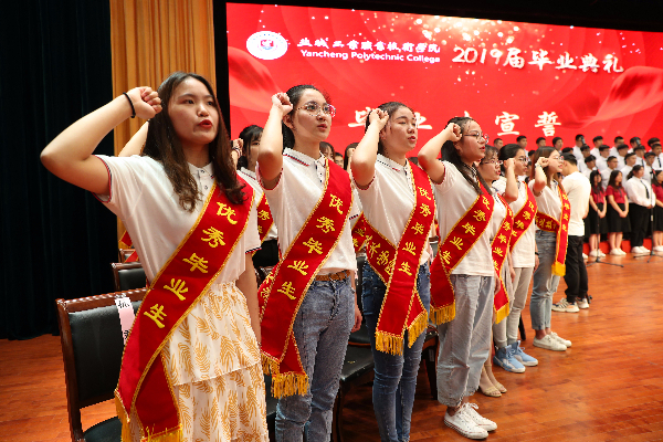 在毕业生代表徐泽同学的带领下,毕业生全体起立,举起右拳庄严宣誓:树立远大理想,志存高远,脚踏实地;热爱伟大祖国,职业立身,技术报国;担当时代责任,勇立潮头,争做先锋;勇于砥砺奋斗,艰苦创业、自强不息;练就过硬本领,精益求精,追求卓越;锤炼品德修为,爱岗敬业、感恩奉献;铭记师长教诲,成就五实人才;奋进新时代,同圆中国梦!