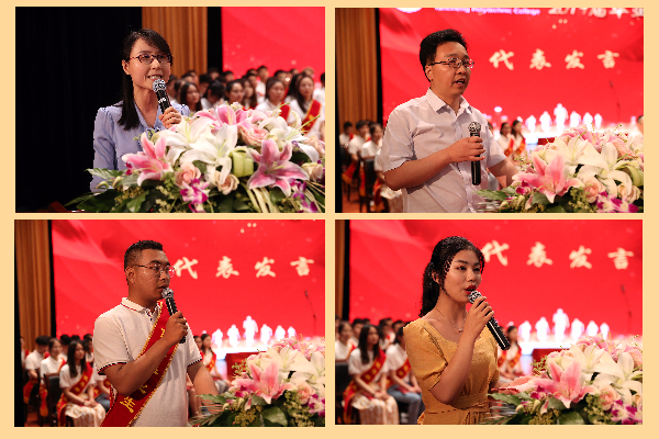 毕业班班主任代表顾东雅老师回顾了自己陪伴大家三年时光中的难忘瞬间,嘱咐大家走上社会要保持积极进取的心态,学会担当,学会包容,开心积极地过好每一天。毕业生家长代表张华东表达了看到子女顺利完成学业的欣喜与感动,抒发了对学校辛勤培育的由衷感谢之情。在校生代表徐璐璐对学长学姐致以美好的祝愿,毕业生代表王程然表达了努力工作、报答母校和社会的坚定信心和决心。