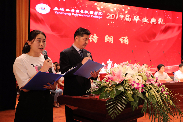 毕业典礼在庄严的国歌声中拉开帷幕。素质教育中心刘沭丰老师和经贸管理学院陈家培同学为大家带来饱含深情的歌颂母校诗朗诵,营造了浓厚的毕业氛围。