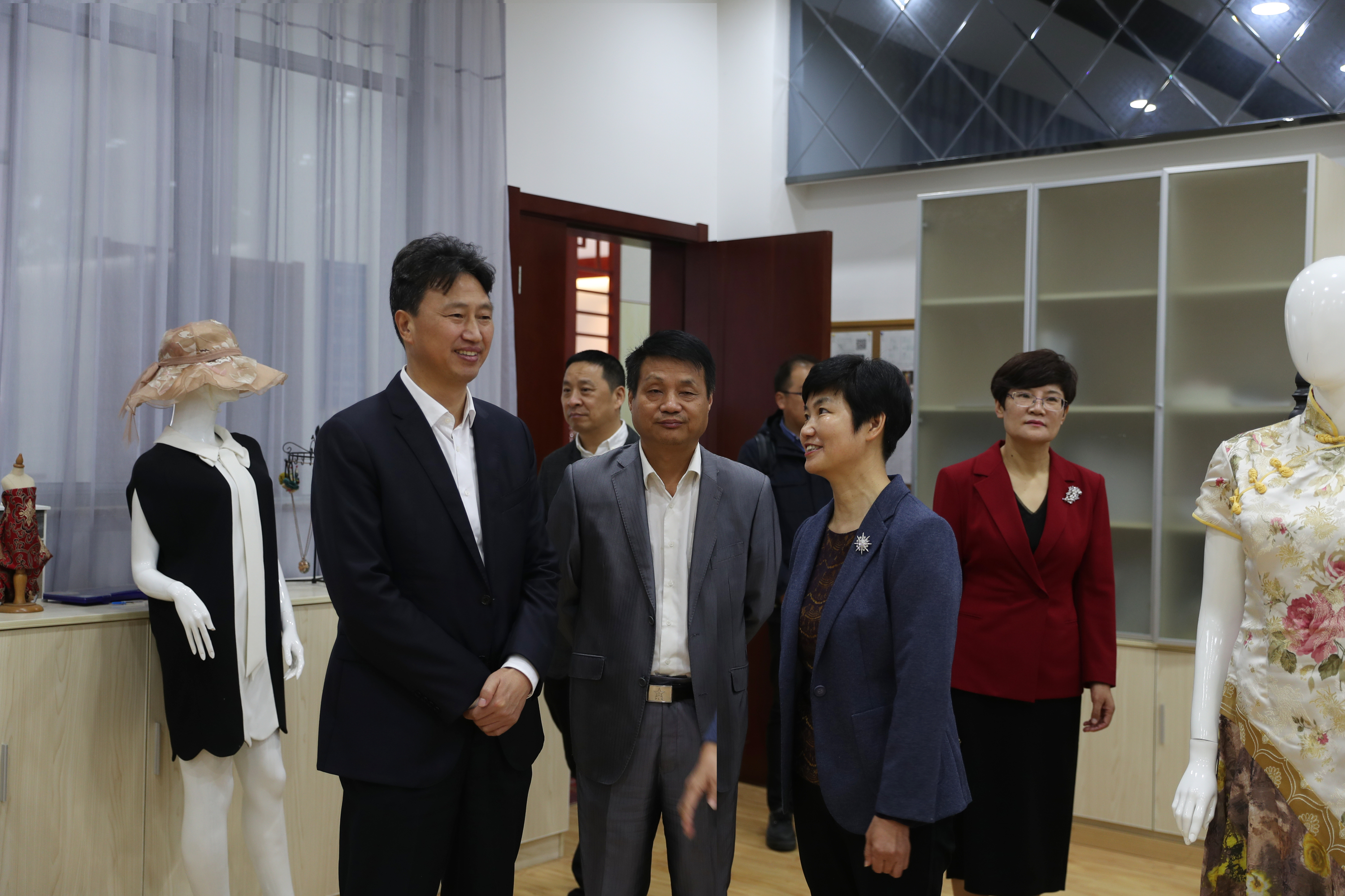 会前,党委书记邵从清、校长瞿才新陪同来宾参观了建筑实体构造实训基地和纺织服装展览馆。