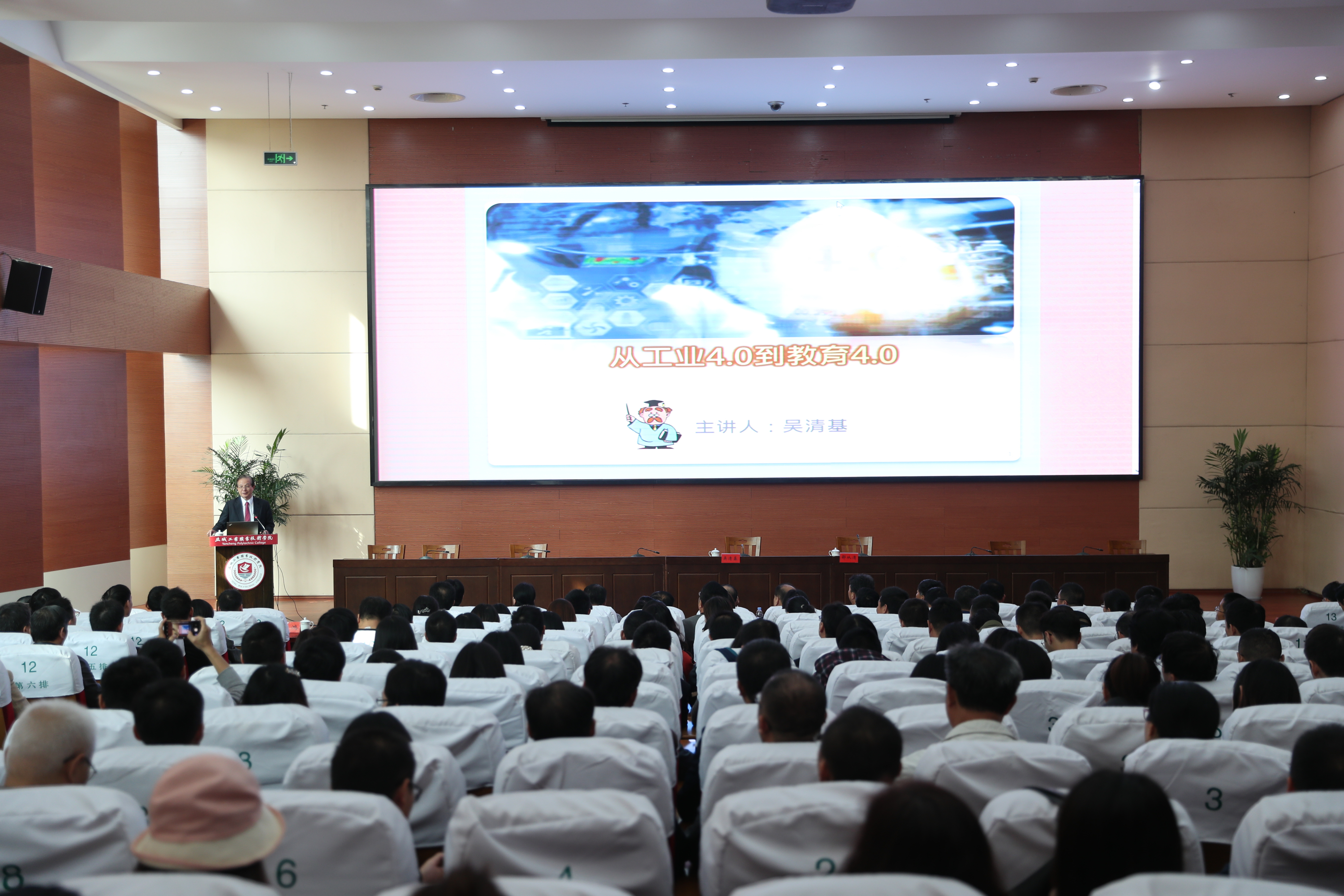 吴清基在学术报告厅作题为《从工业4.0到教育4.0》的学术讲座。校领导班子、中层干部、师生代表300多人聆听讲座。吴教授从工业4.0之缘起、工业革命与教育发展之因应、工业4.0对智慧化校园教育发展之影响、教育4.0之学校教育新图像——智慧校园、教育4.0——未来学校师资培育之政策和未来学校教师的新图像等六个方面进行了讲解。