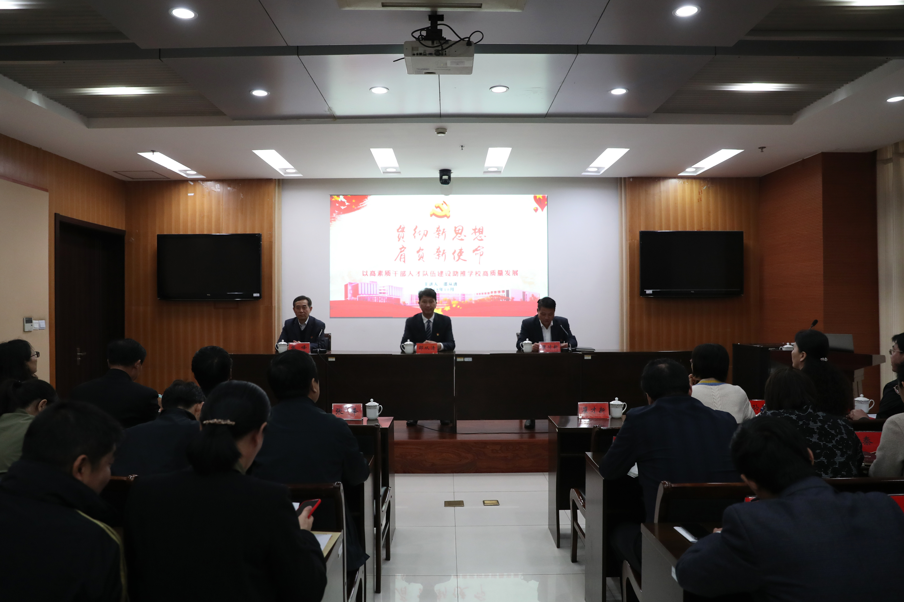 邵从清引用习近平总书记“无论我们走得多远,都不能忘记来时的路”的论述和北宋大儒张载《横渠语录》“为天地立心,为生民立命”,深入阐释教育的“初心使命”,深度总结分析学校干部和人才队伍建设工作的成效,干部和人才队伍的整体素质明显提高,知识结构、专业结构、年龄结构逐步优化,为学校管理水平和办学能力提升,促进内涵发展提供了有力的保证,但是,也必须清醒地认识到,从推进高质量发展的新时代要求来看,仍存在一些不容忽视的问题,需要我们加快高素质干部和人才队伍建设。他指出,新时代焕发新风貌,新时代需要新担当。党员干部要担当作为、追求卓越、率先垂范,切实做到敢于“靠前站”、敢于“领着干”、敢于“向我看”,不改初心,努力为师生服务。