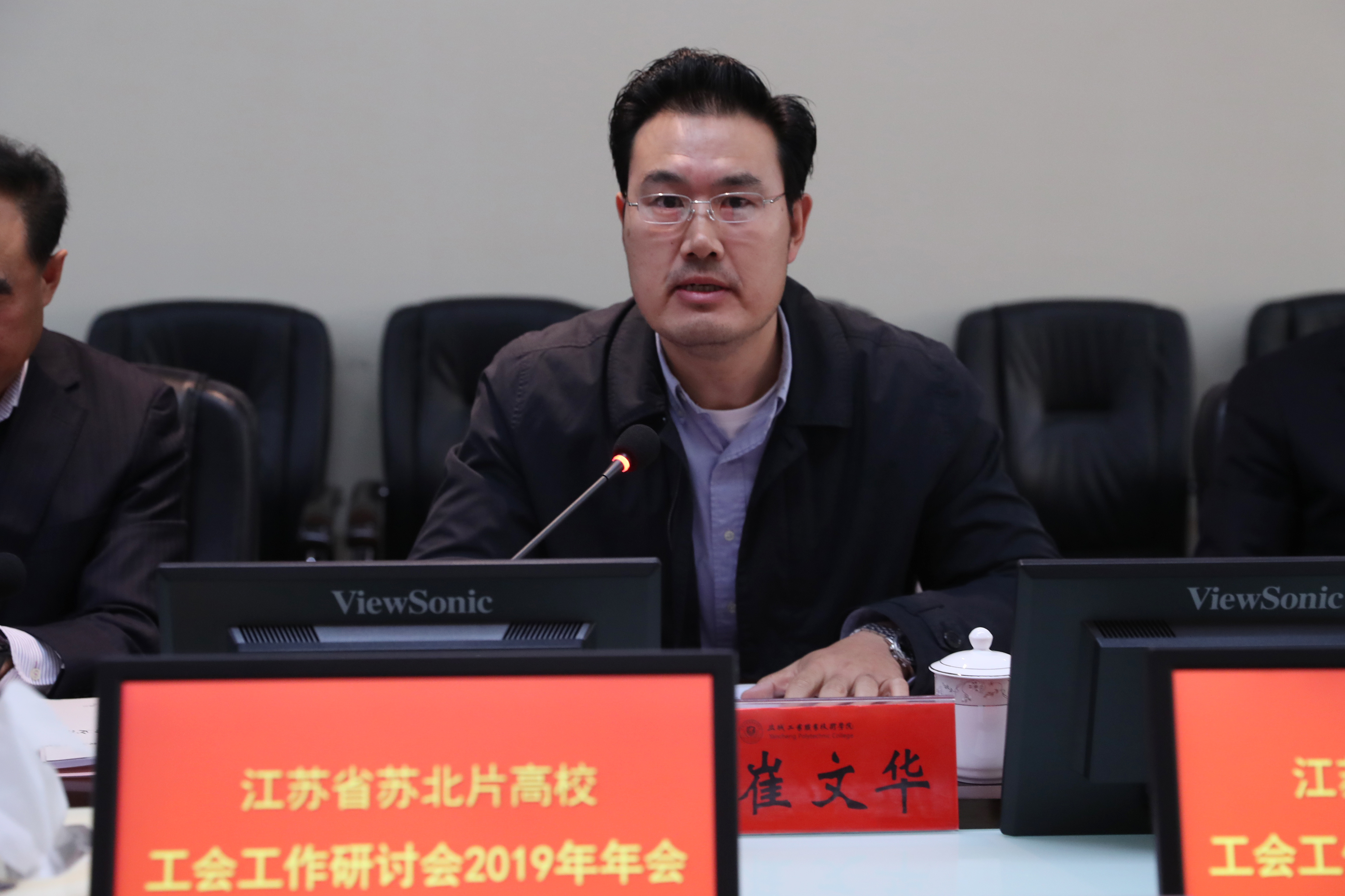 崔文华传达了全国教科文卫体系统扩大工会组织覆盖面工作会议和江苏省总工会十四届四次全委会会议精神,并对做好高校工会工作提出要求,一是要强化政治责任,引领广大教职工听党话跟党走;二是要履行维权职责,竭诚服务教职工;三是要发挥桥梁纽带作用,加强自身建设,着力打造更高水平的职工之家。