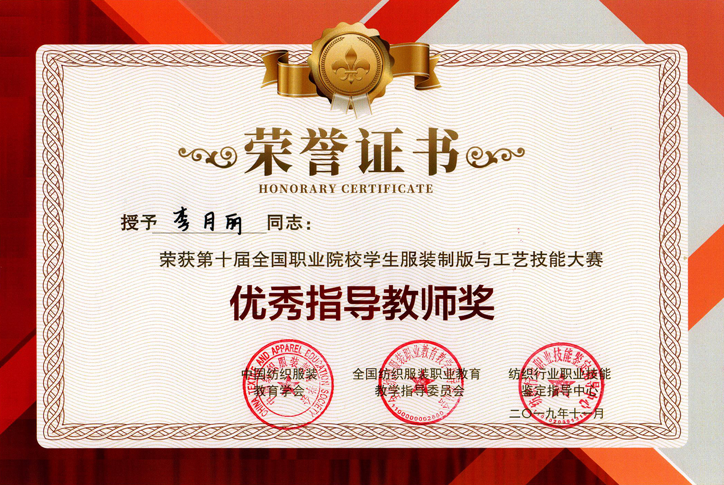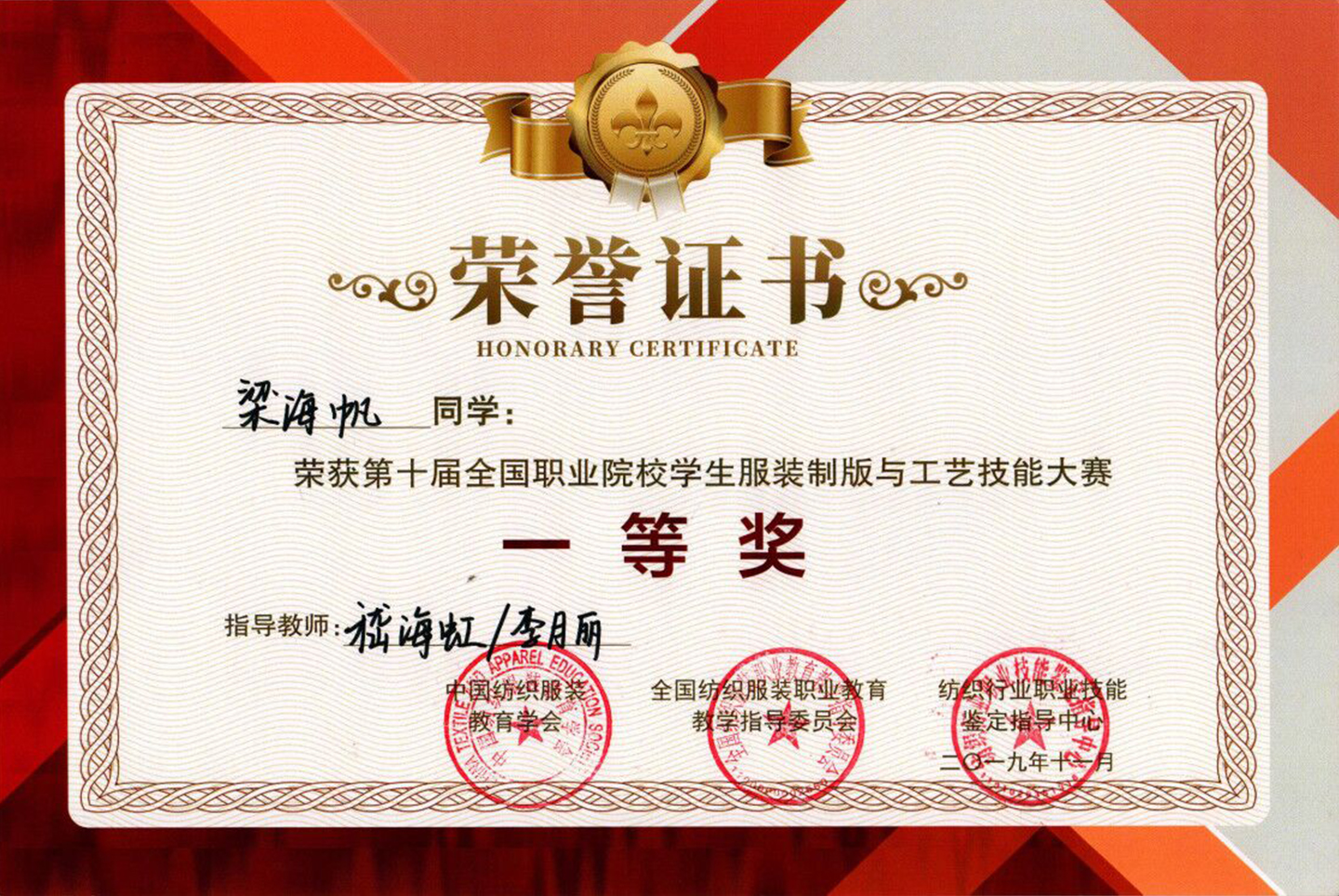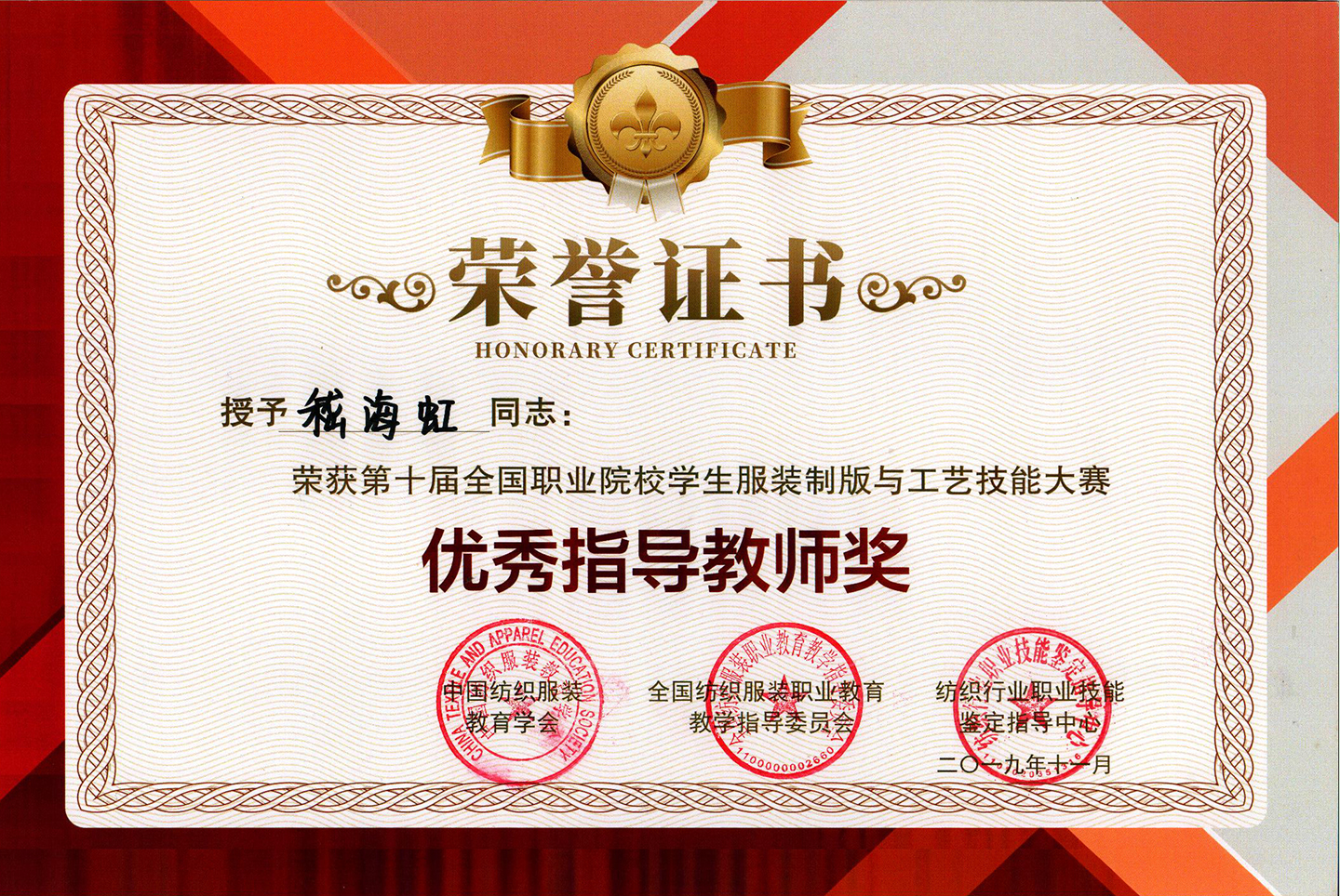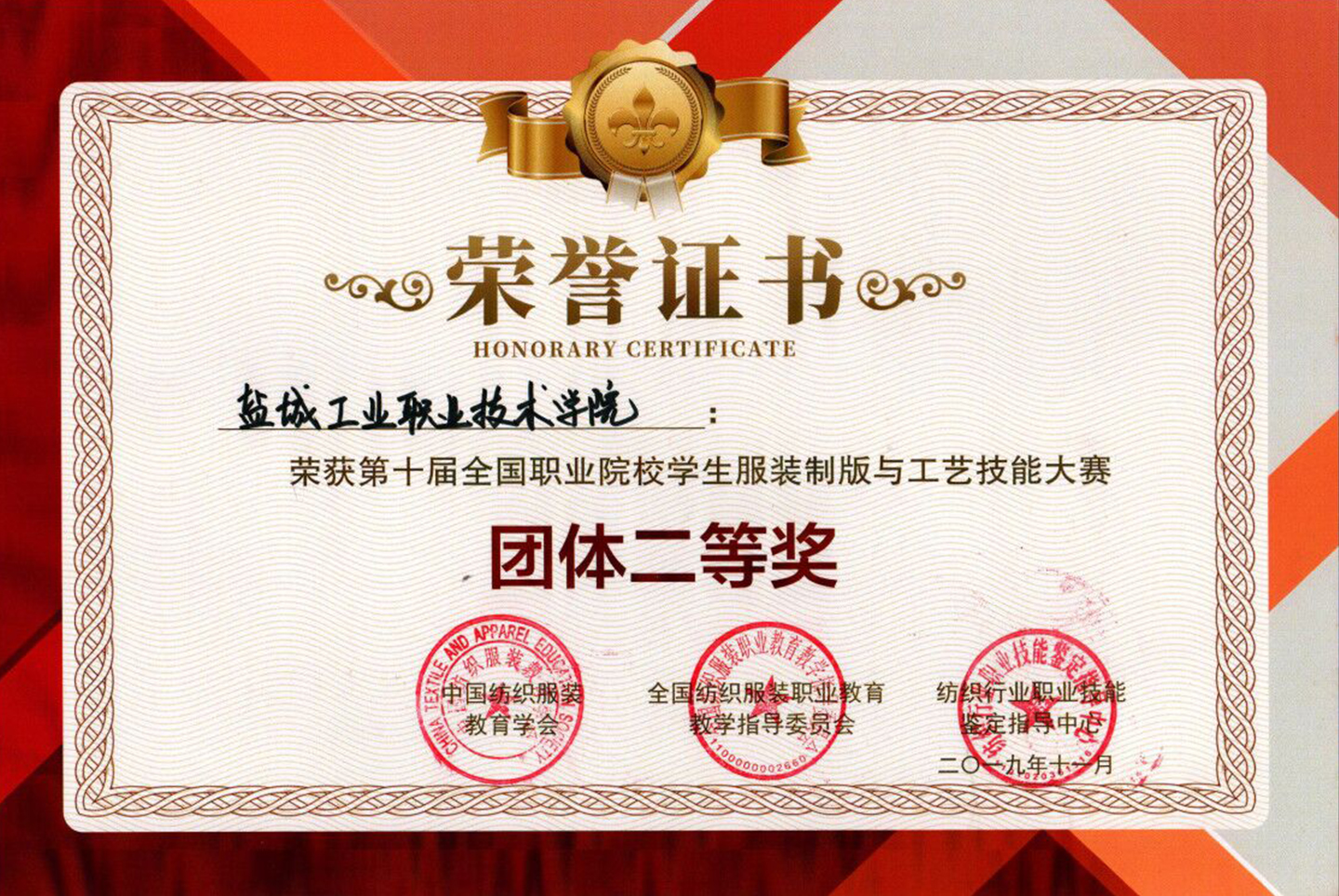 11月23日至24日,第十届全国职业院校学生服装制版与工艺技能大赛在成都纺织高等专科学校举行。我校荣获团体二等奖,纺织服装学院梁海帆同学获得一等奖,周倩倩、张子健同学获得二等奖,嵇海虹、李月丽两位老师获得优秀指导教师奖。