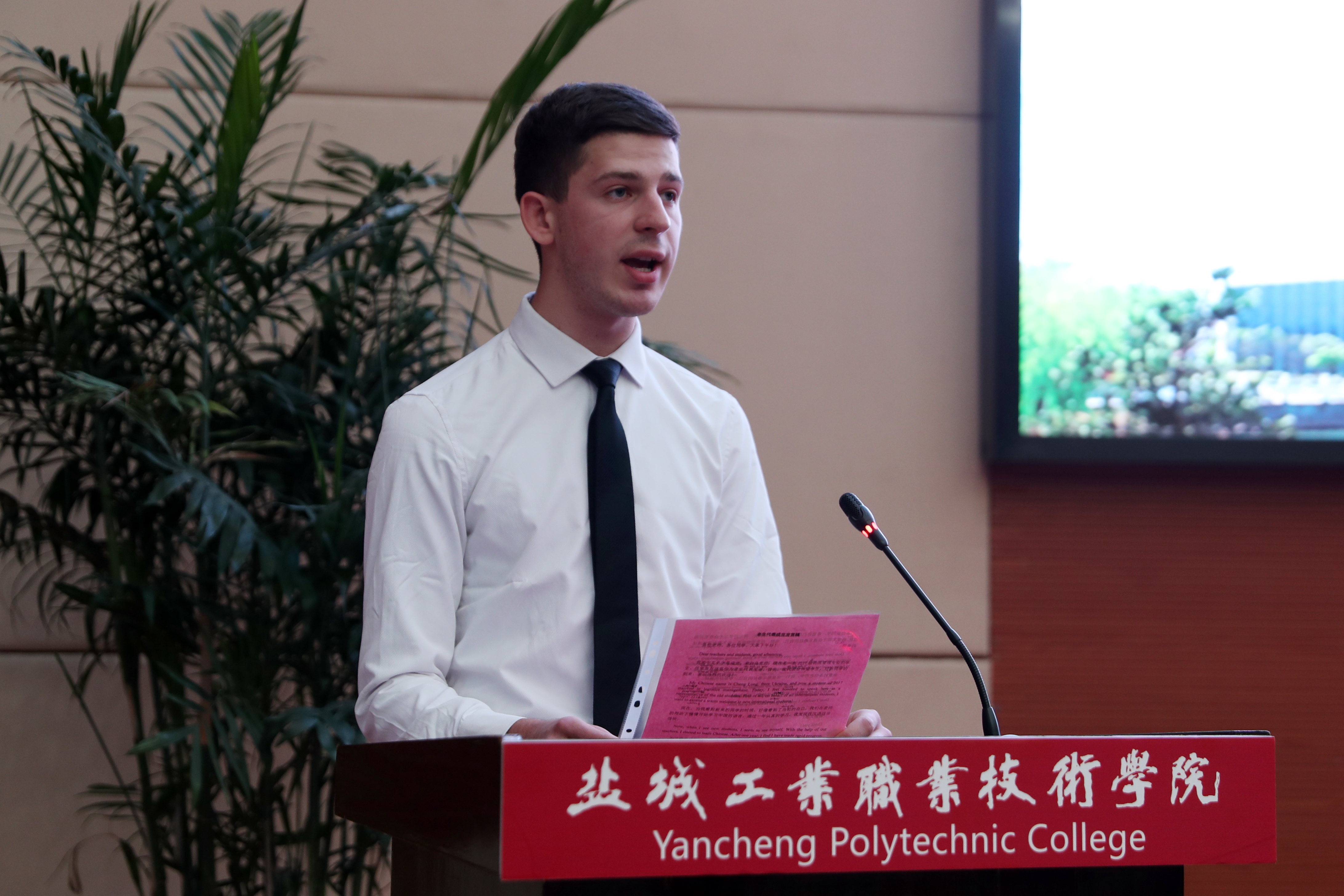 典礼上,留学生代表2018级物流管理专业乌克兰籍留学生成龙和2019级哈萨克斯坦籍留学生宁娜分别作了发言。