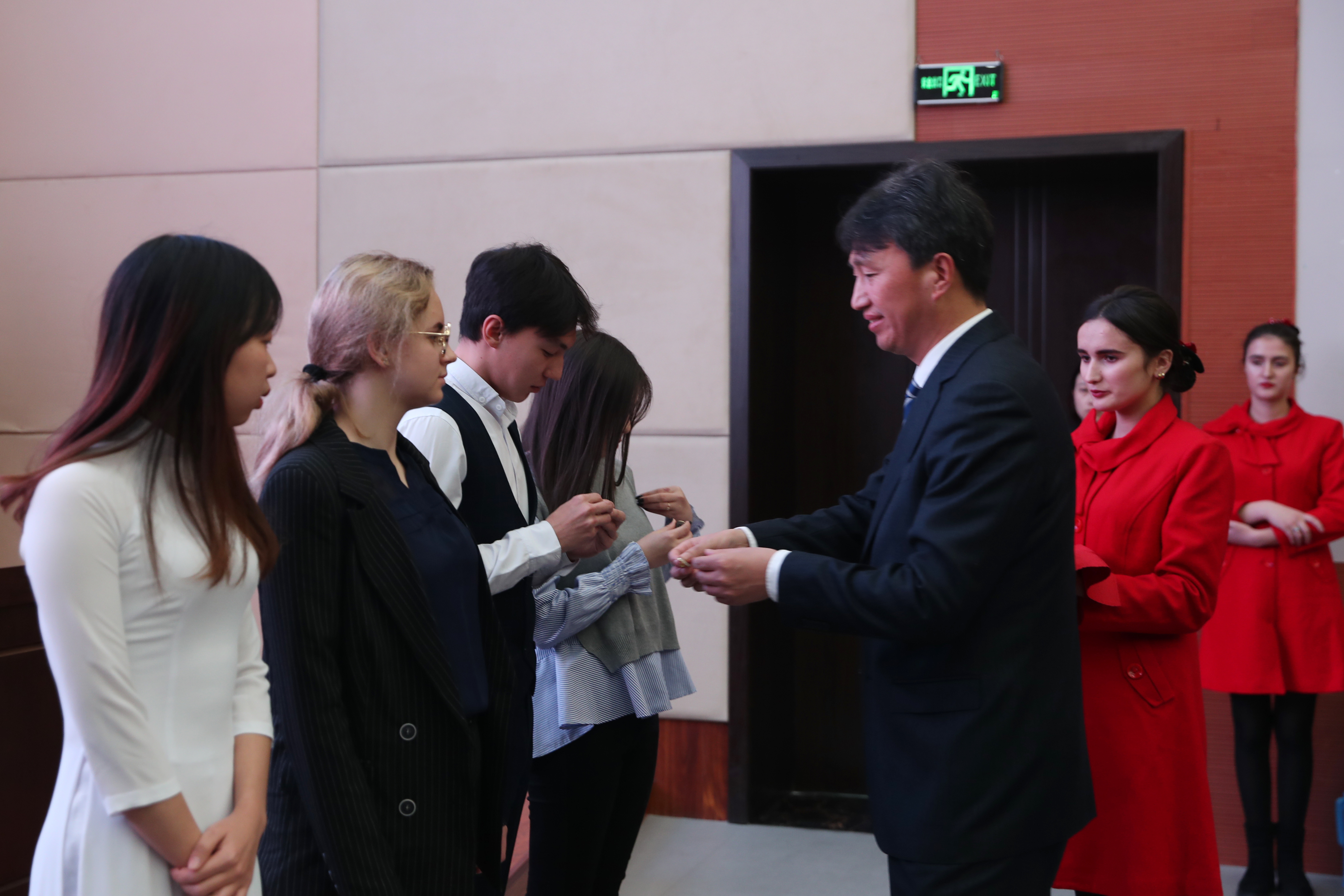 邵从清为2019级新生代表颁发了校徽,标志着2019级留学生正式成为“盐工院”大家庭的一份子。