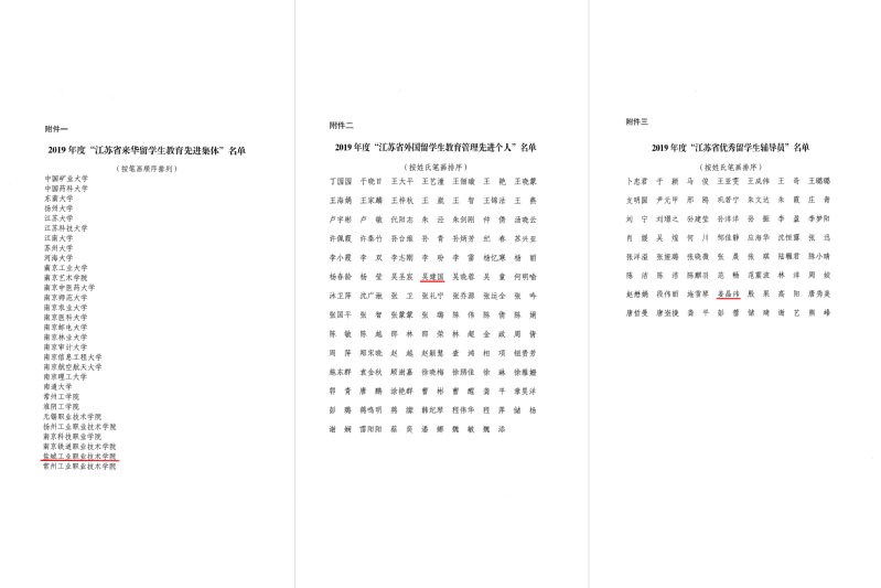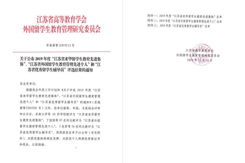 近日,江苏省高等教育学会外国留学生教育管理研究委员会公布了2019年度“江苏省来华留学生教育先进集体”“江苏省外国留学生教育管理先进个人”和“江苏省优秀留学生辅导员”评选结果,我校荣获“江苏省来华留学生教育先进集体”称号,这是我校2018年荣获“江苏省来华留学生教育先进集体”后再次获此殊荣。此外,吴建国获评“江苏省外国留学生教育管理先进个人”,姜晶玮获评“江苏省优秀留学生辅导员”。