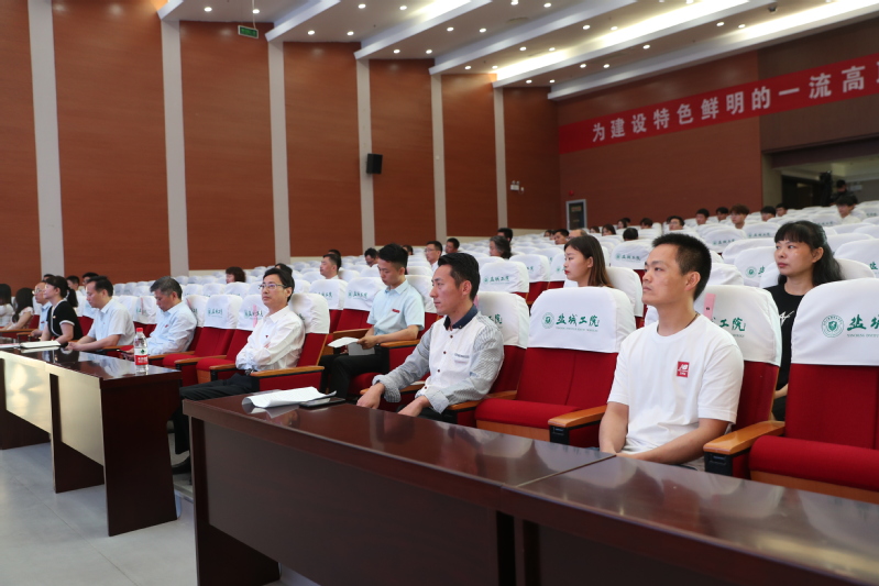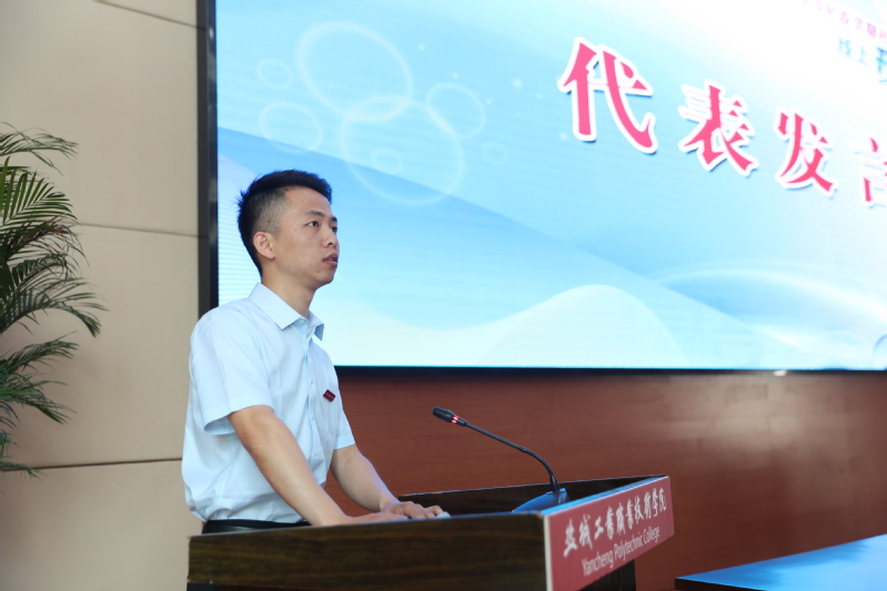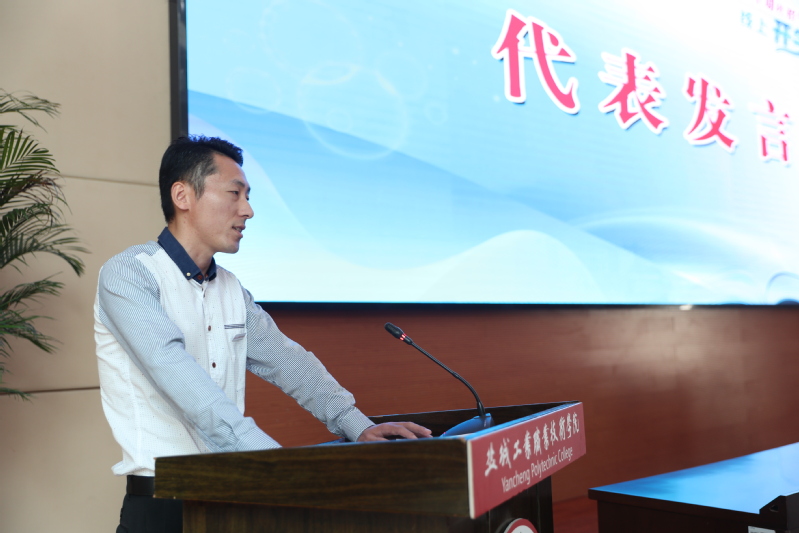 教师代表开绍森老师、新生代表耿其石同学先后作了发言。教务处处长李桂付从学生、教师、二级学院三个层面,宣读了社招学生教学管理工作规定和有关要求。与会校领导为新生代表颁发了校徽。
